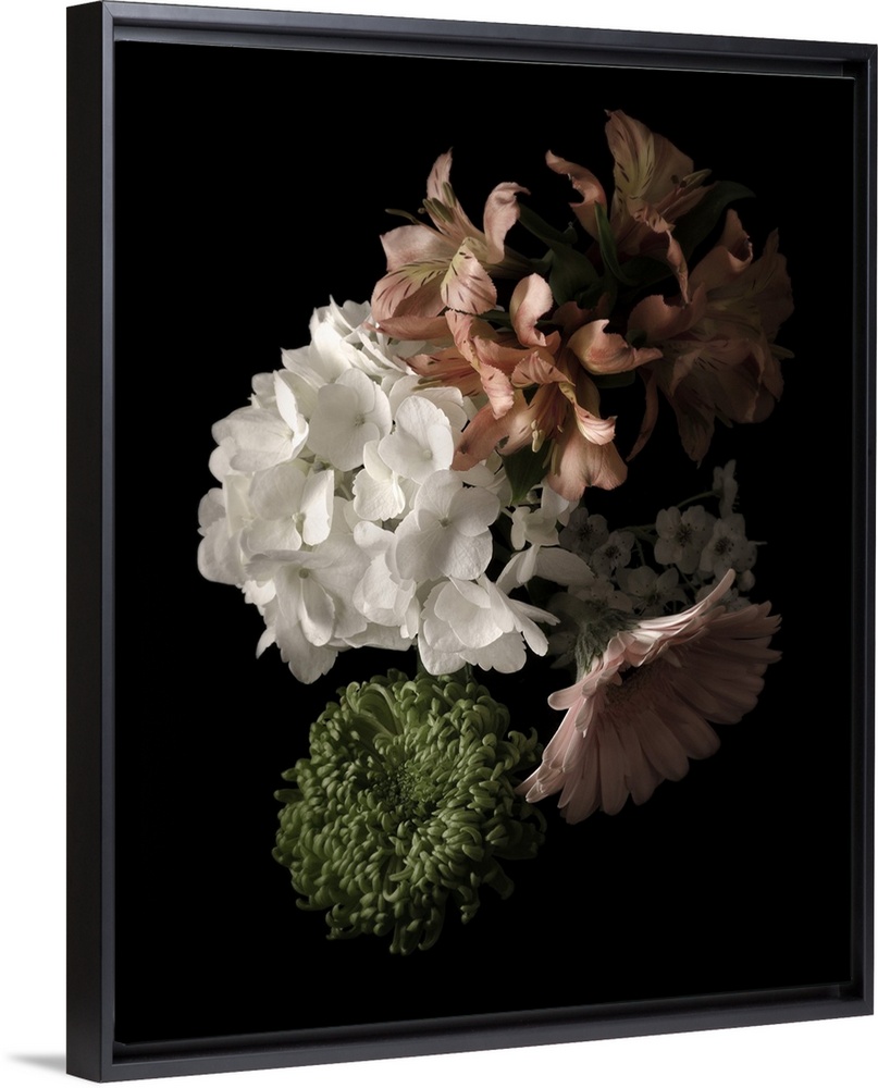 <p>Moody photograph of a bouquet of pastel flowers on black in low light.</p>