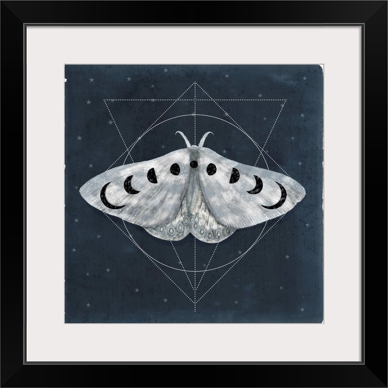 <p>Watercolor moth with moon shapes on its wings in front of geometric shapes on a navy background.</p>