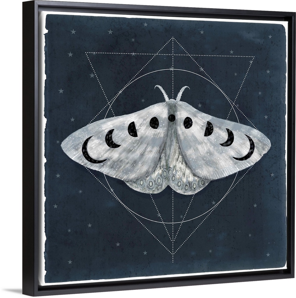 <p>Watercolor moth with moon shapes on its wings in front of geometric shapes on a navy background.</p>
