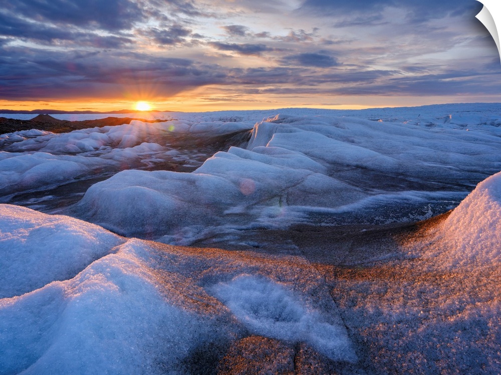 <p>Midnight sun on the ice sheet. The brown sediment on the ice is created by the rapid melting of the ice. Landscape of Greenland near Kangerlussuaq, Kingdom of Denmark.</p>