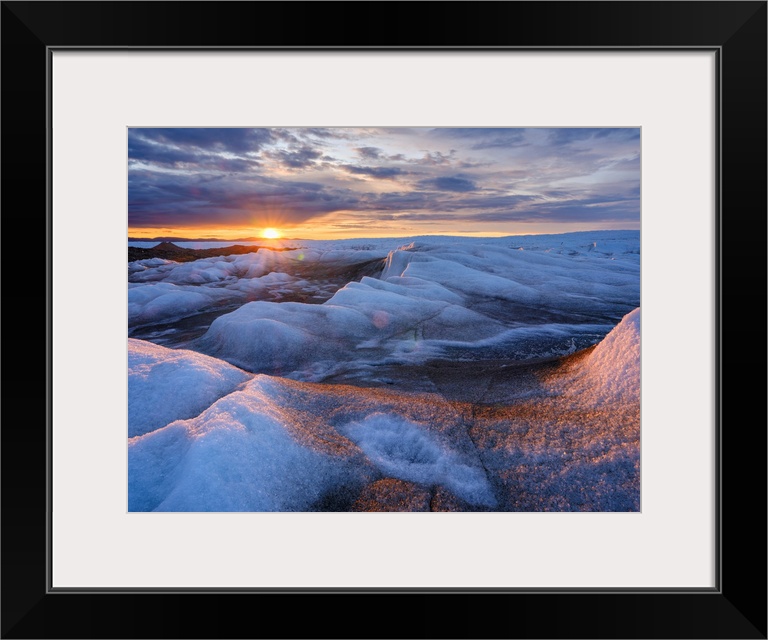 <p>Midnight sun on the ice sheet. The brown sediment on the ice is created by the rapid melting of the ice. Landscape of Greenland near Kangerlussuaq, Kingdom of Denmark.</p>