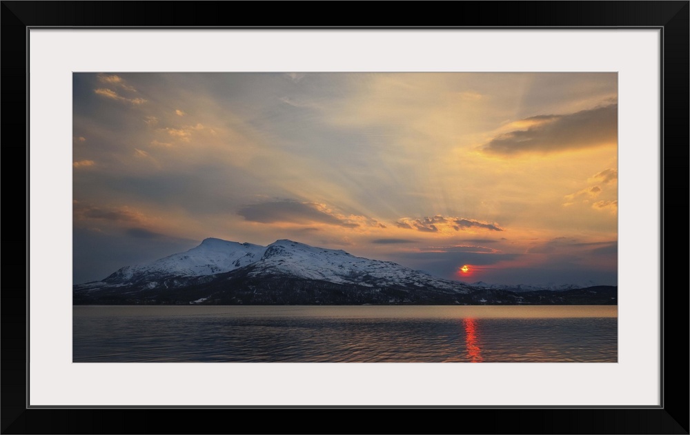 <p>Midnight Sun over Tjeldsundet and the Saetertinden Mountain in Troms County, Norway.</p>