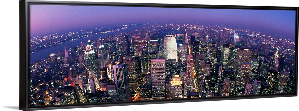 <p>Wall docor of a sky view of New York City's illuminated streets and buildings that reach towards a horizon of evening colors.</p>
