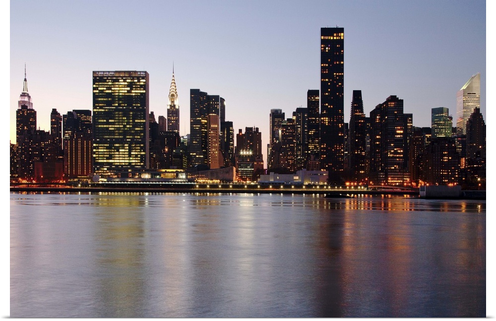 <p>Buildings include Empire State, UN Headquarters, Chrysler, Trump and Citigroup Center, viewed over The East River from Long Island City, Queens.</p>