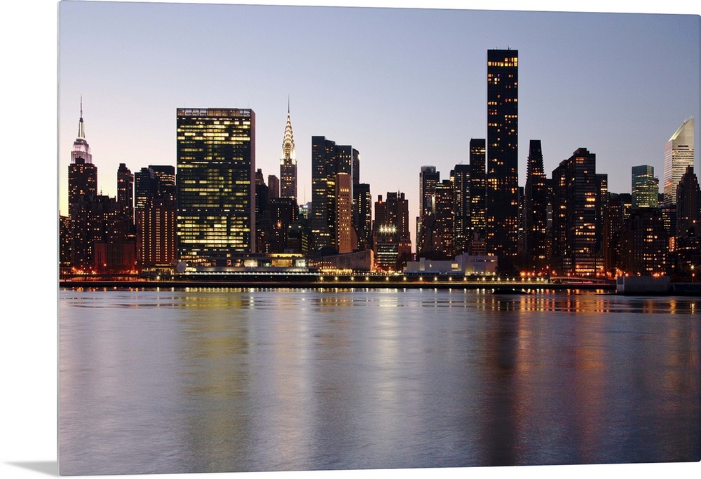 <p>Buildings include Empire State, UN Headquarters, Chrysler, Trump and Citigroup Center, viewed over The East River from Long Island City, Queens.</p>
