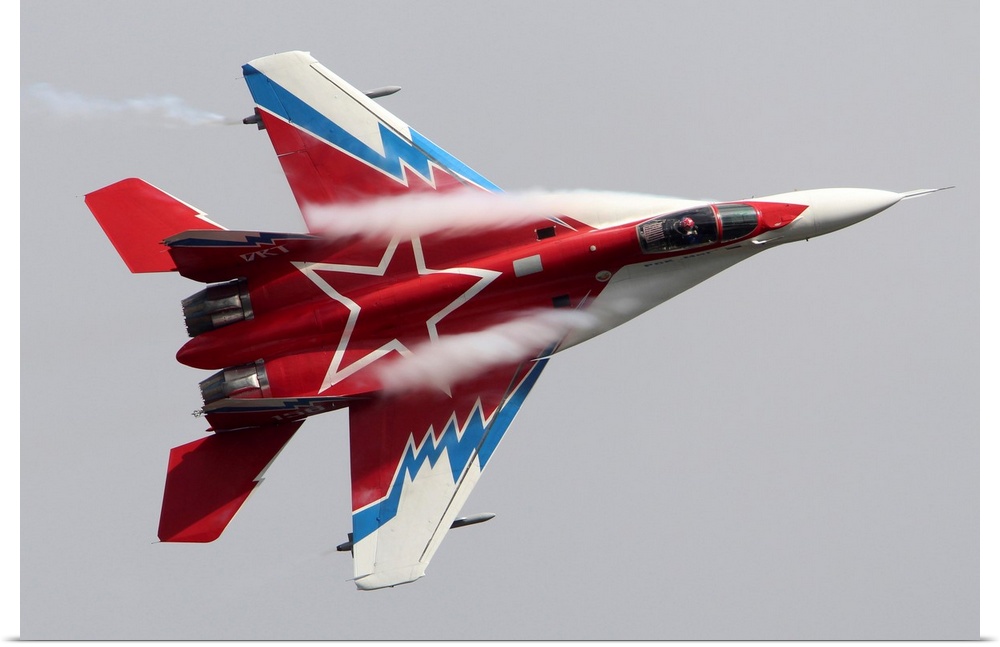 <p>MiG-29OVT jet fighter performing demonstration flight.</p>