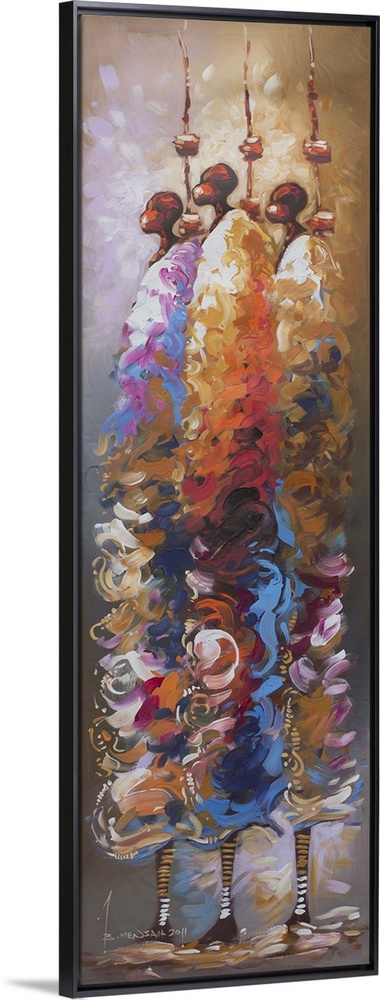 <p>Standing straight and tall, three African men hold spears as they gaze toward the future. Bernard Mensah pays tribute to the ancestors whose unwavering courage and resolve made them examples for modern youth. Nothing can stop these men from achieving what they want to, even when others have given up, the Ghanaian artist affirms.</p>