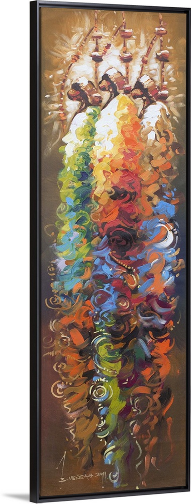 <p>Tall, proud, unwavering in their courage, three African men inspire Bernard Mensah. Enveloped in brilliant color, they hold spears, in tribute to past traditions. Nothing can stop them, the Ghanaian artist says.</p>