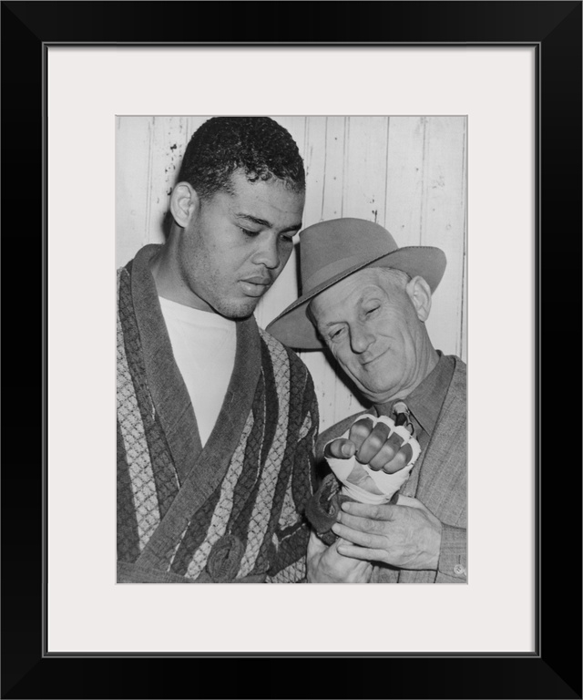 <p>Mike Jacobs inspects Joe Louis' fist before the heavy weight champion would defend his title against Lou Nova on Sept. 29, 1941. In 1935 Jacobs worked to overcome informal barriers that kept African American boxers out of big title fights. Two years later, Louis won the World Championship against James Braddock on June 22, 1937.</p>