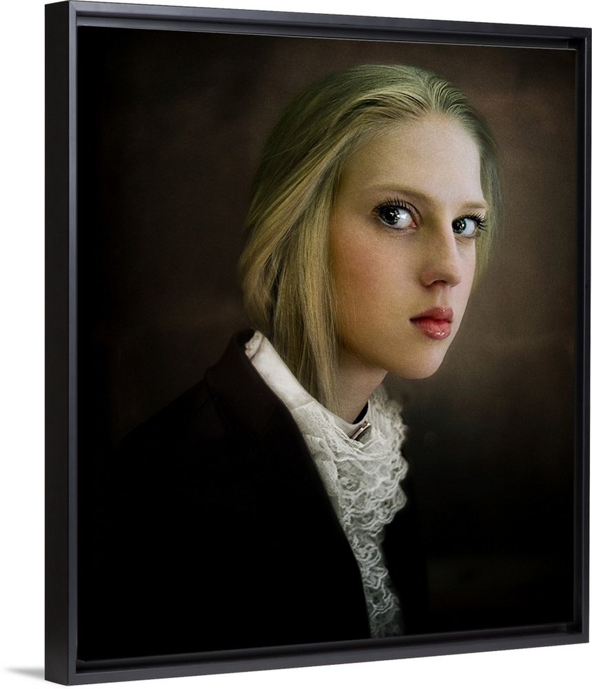 <p>Portrait of a young blonde woman with large eyes and a lace blouse.</p>