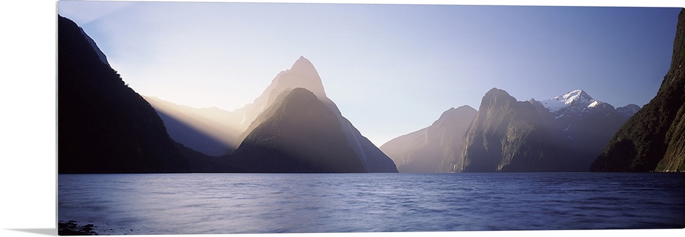 <p>Mountain range at water's edge, Milford Sound, Fiordland National Park, South Island, New Zealand</p>