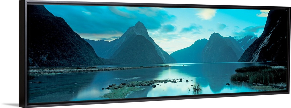 <p>Mountains reflecting in the smooth surface of a lake in this landscape panoramic photograph.</p>