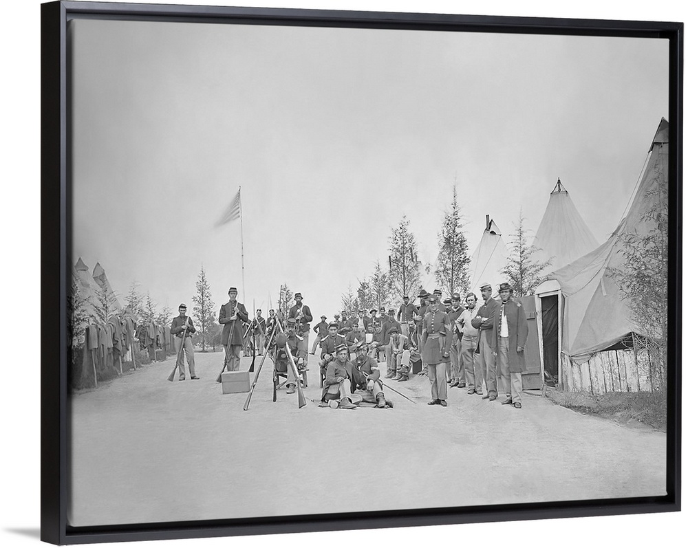 <p>Military camp with soldiers in street during the American Civil War.</p>