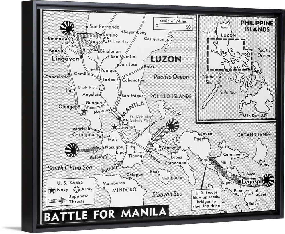 <p>From Lingayen to Legaspi, 350 miles across the mountains and valleys of Luzon, winds the front of the Battle for Manila. Map shows threat from four sides where Japs are attacking close to Philippine capital.</p>