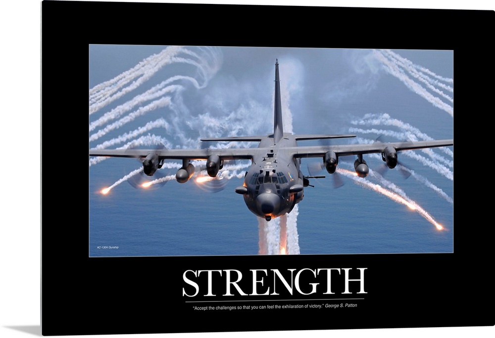 <p>Big canvas of a military plane firing flares with the text "Strength" at the bottom.</p>