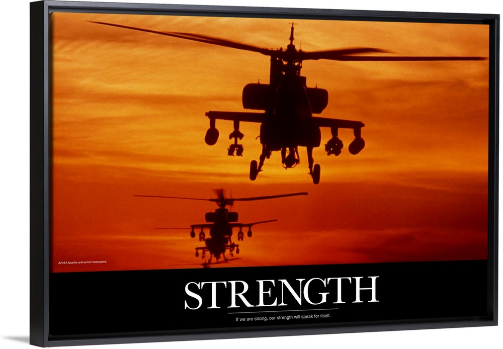 <p>Three military helicopters are photographed during a sunset and has the word "Strength" written in bold white text below.</p>