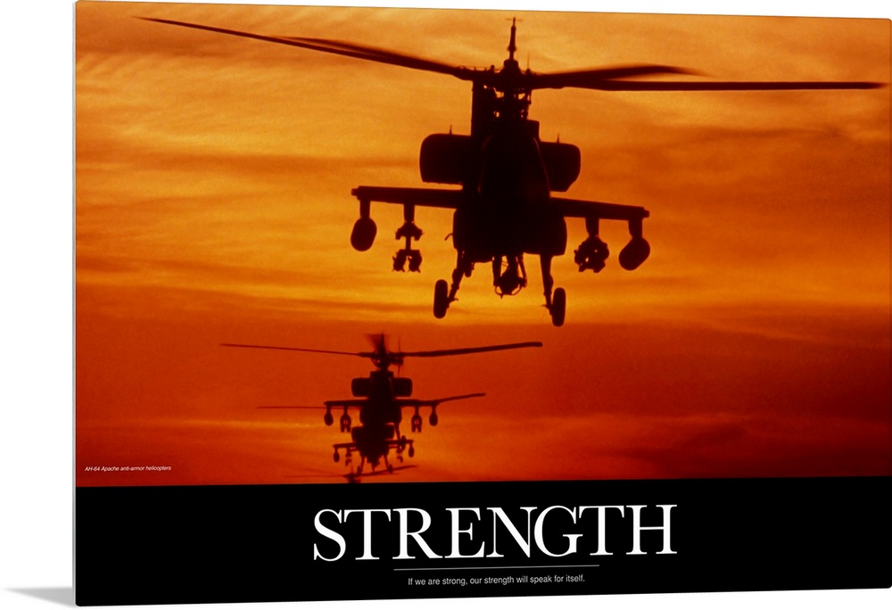 <p>Three military helicopters are photographed during a sunset and has the word "Strength" written in bold white text below.</p>