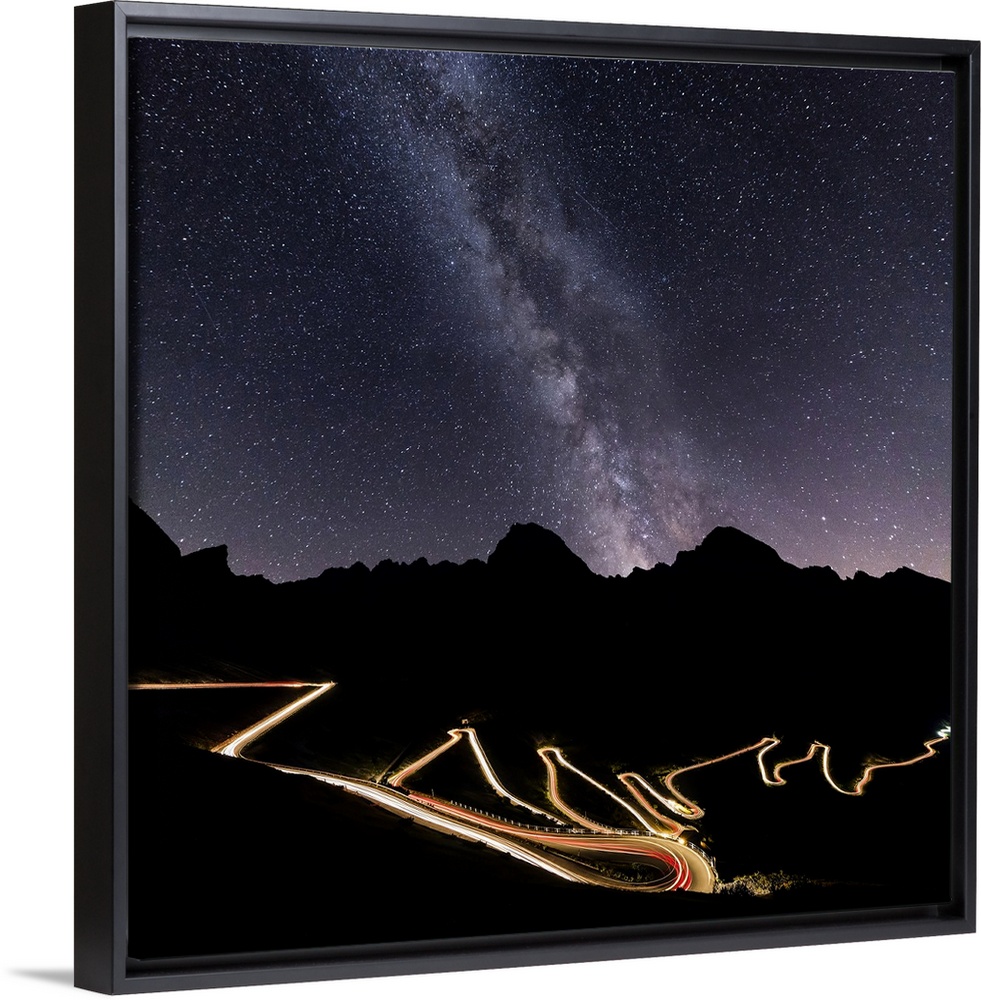 <p>Panorama of the Milky Way and lights of car trace at Stelvio Pass, Valtellina, Lombardy, Trentino Alto Adige, Italy, Europe</p>