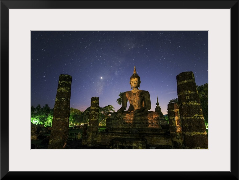 <p>The Milky way and Venus shine in the evening twilight above a buddha in Sukhothai, Thailand.</p>