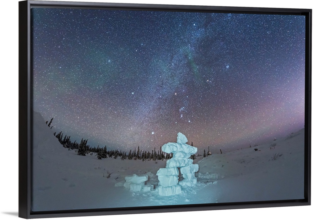 <p>Milky Way and winter stars over a mock-up inukshuk figure made of snow, Canada.</p>
