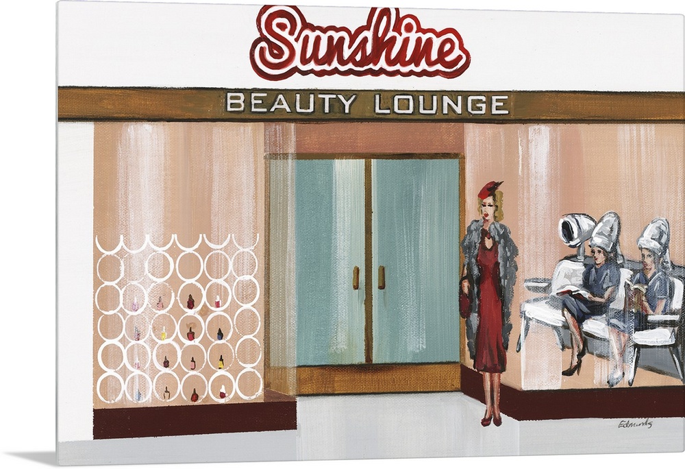 <p>Contemporary painting of a woman in a red dress standing outside of a beauty lounge with two woman inside sitting under hairdryers.</p>