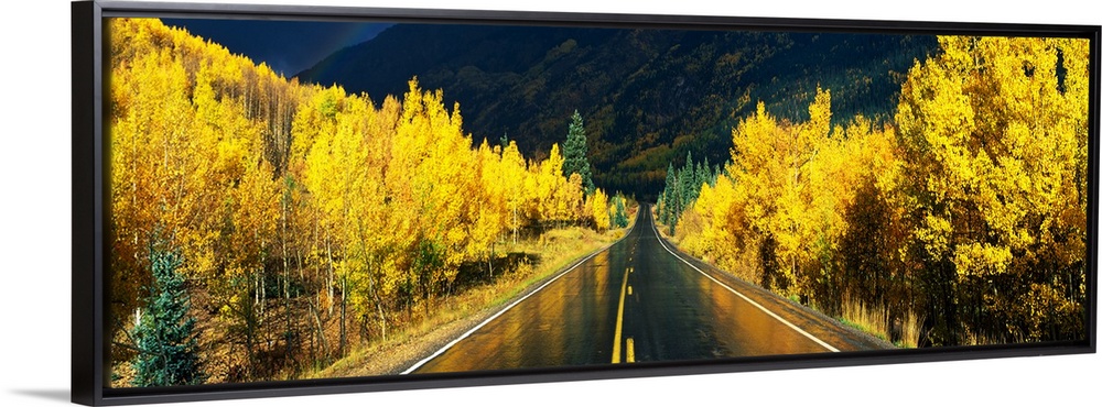 <p>Panoramic photograph shows a wet roadway in Colorado faintly displaying the blurry reflection of the surrounding trees over its surface. The roadway can be seen making its way into the distance and running next to a large mountain.</p>