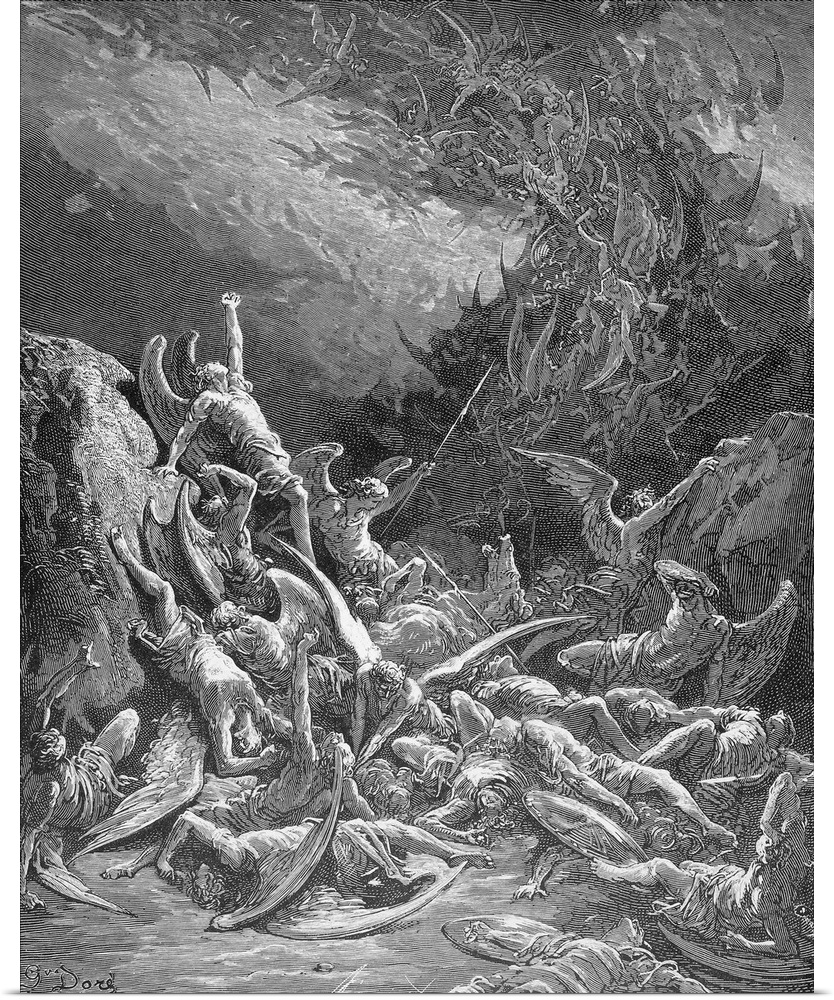 <p>The rebel angels are defeated and are forced to cast themselves out of Heaven headlong into a ghastly abyss (Book 6, line 871). Wood engraving after Gustave Dore for John Milton's 'Paradise Lost.'</p>
