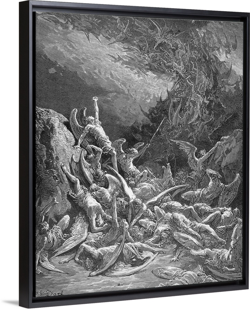 <p>The rebel angels are defeated and are forced to cast themselves out of Heaven headlong into a ghastly abyss (Book 6, line 871). Wood engraving after Gustave Dore for John Milton's 'Paradise Lost.'</p>