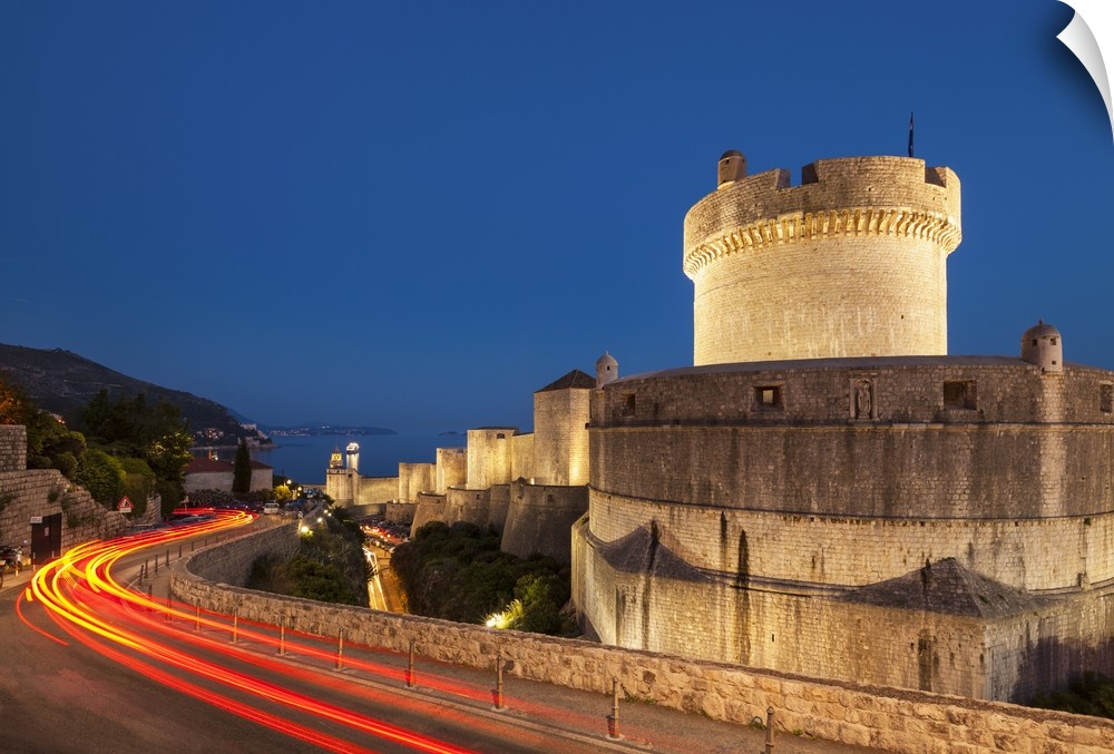 <p>Minceta tower and city walls with traffic light trails, Dubrovnik Old Town, Dubrovnik, Dalmatian Coast, Croatia</p>