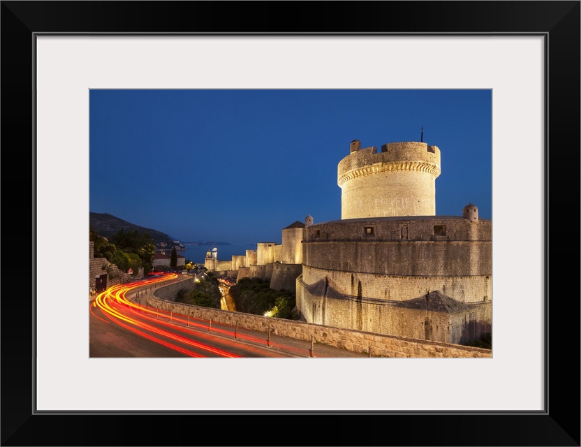 <p>Minceta tower and city walls with traffic light trails, Dubrovnik Old Town, Dubrovnik, Dalmatian Coast, Croatia</p>