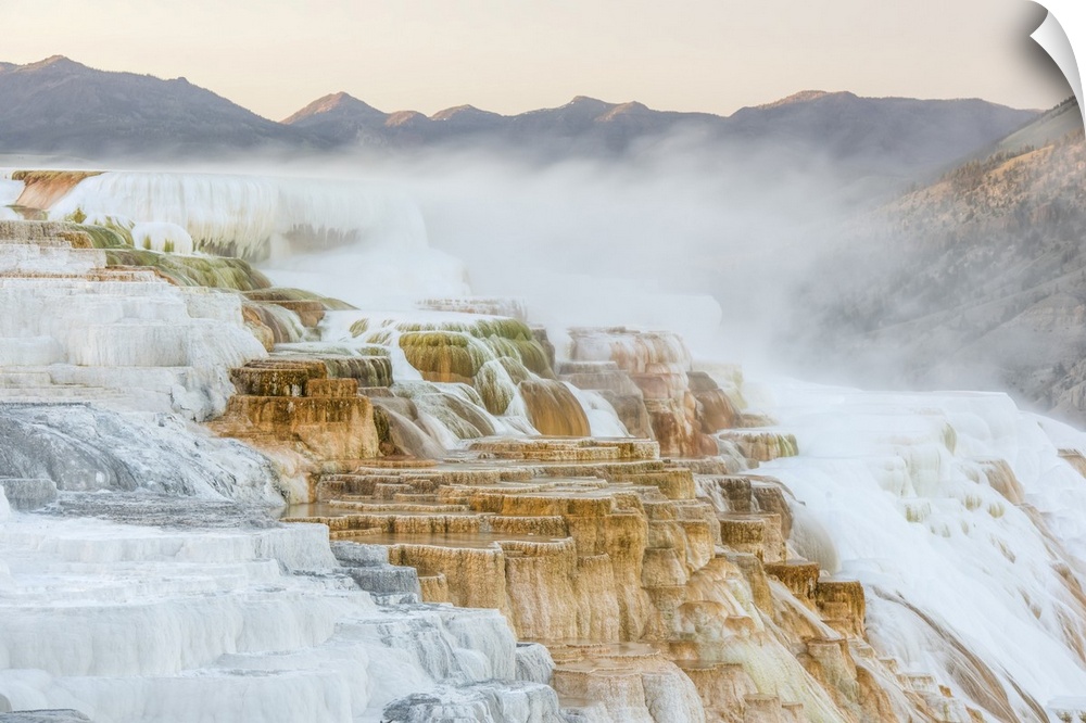 <p>Mineral deposits and steam vapors of Canary Spring at the Mammoth Hot Springs in Yellowstone Natural Park, Wyoming, United States of America</p>