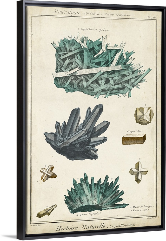 <p>This decorative artwork features rock and crystalline illustrations over an aged background with French footnotes.</p>