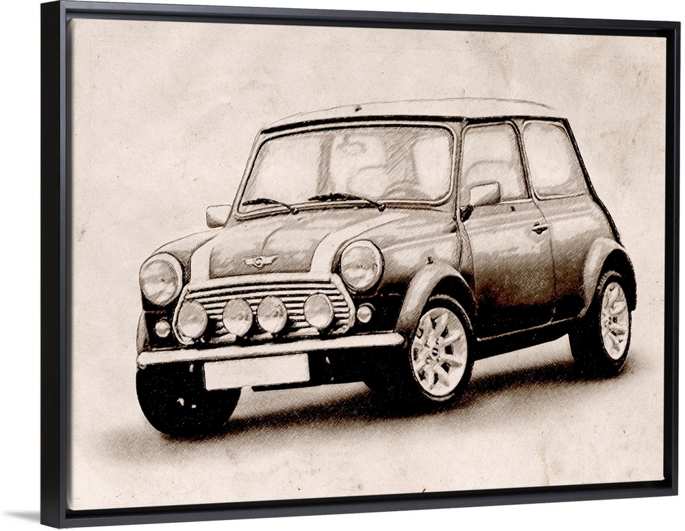 <p>Large horizontal artwork of a classic Austin Mini Cooper on a paper background.</p>