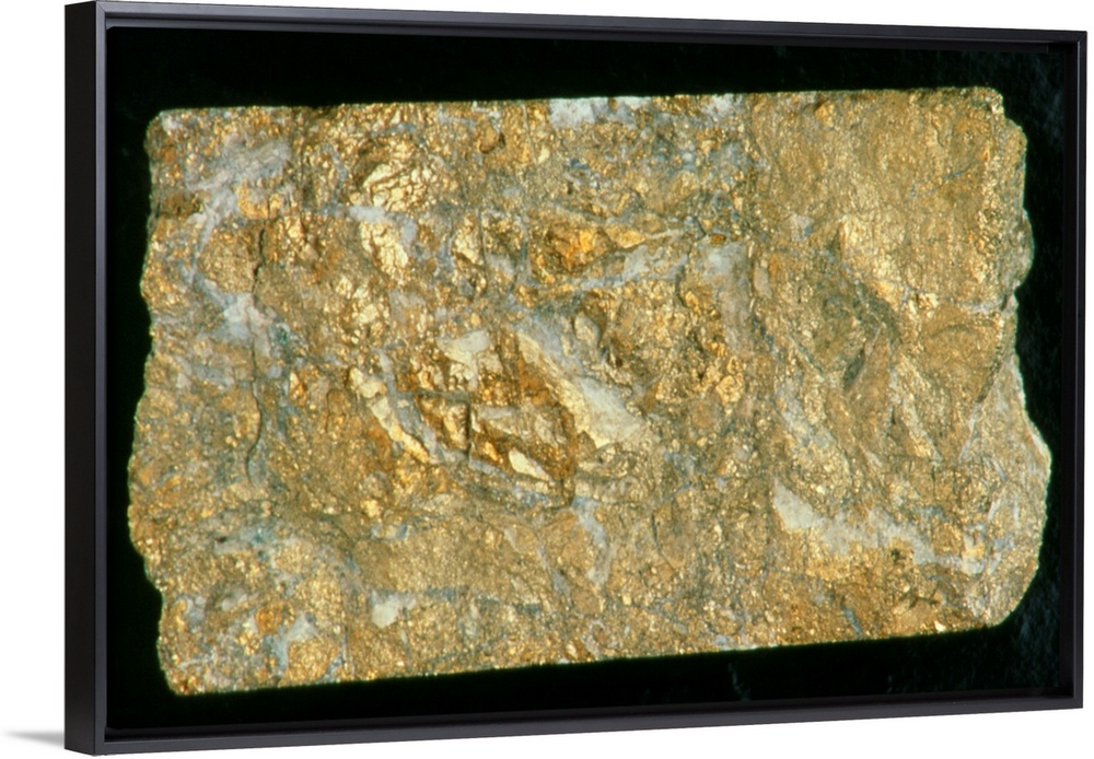 <p>Gold ore. A mining drill sample with a high concentration of gold ore. This soft, heavy, acid- resistant metal is usually found in quartz veins, as a natural alloy with silver, and in concentrations of sedimentary origin. The main gold- bearing districts are Witwatersrand (South Africa), the Mother Lode (California, USA), the Yukon (Alaska, USA), Porcupine (Northwest Territory, Canada) and the USSR. It is used as a monetary standard, in jewellery, in dentistry and for scientific and electronic instruments.</p>