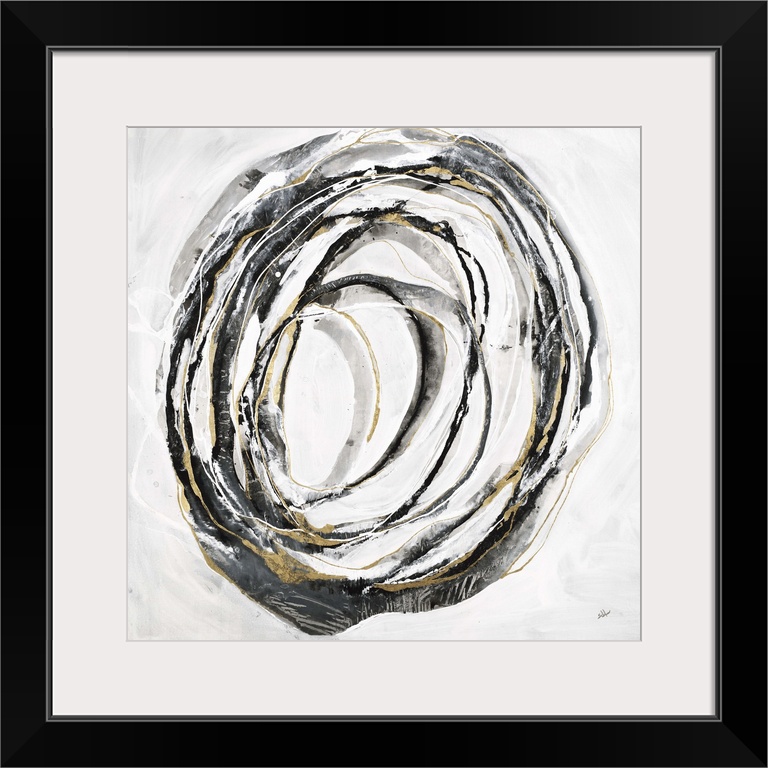 <p>Square abstract art with thin black, gray, and gold lines making one big circle in the center of the canvas.</p>
