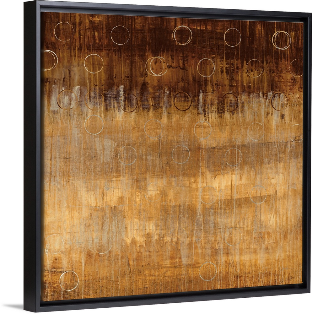 <p>Abstract painting on a square canvas of circles drawn over top of an earth toned gradient.</p>