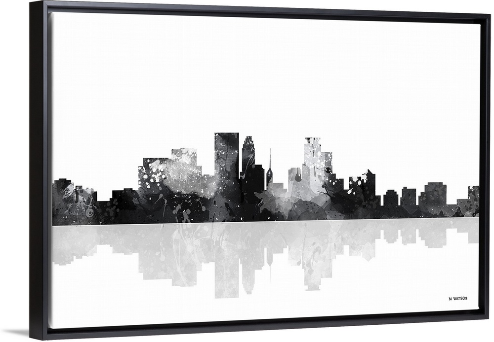 <p>Contemporary black and white watercolor skyline casting a mirror-like reflection below.</p>