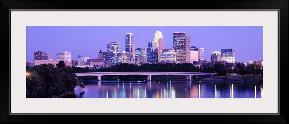<p>Panoramic photograph of cityscape with downtown building lit up. The lights and building are reflected in water.</p>