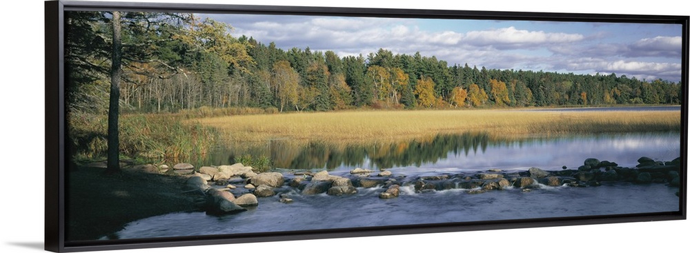 <p>Panoramic photograph of rocky river with forest in the distance under a cloudy sky.</p>