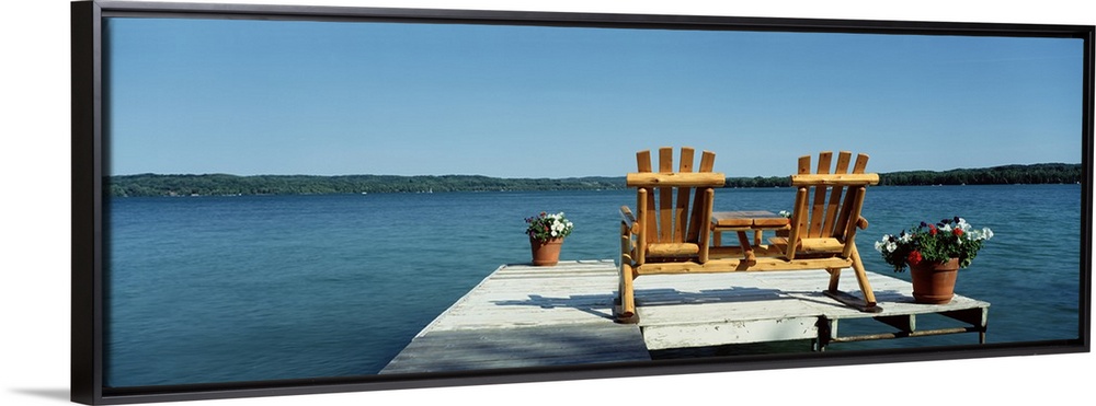<p>This panoramic photograph is taken from behind two chairs sitting on a dock looking out over a body of water and land in the distance.</p>