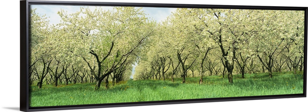 <p>Wide angle photograph on a large wall hanging of many rows of blooming cherry trees in a grassy orchard, in Minnesota.</p>