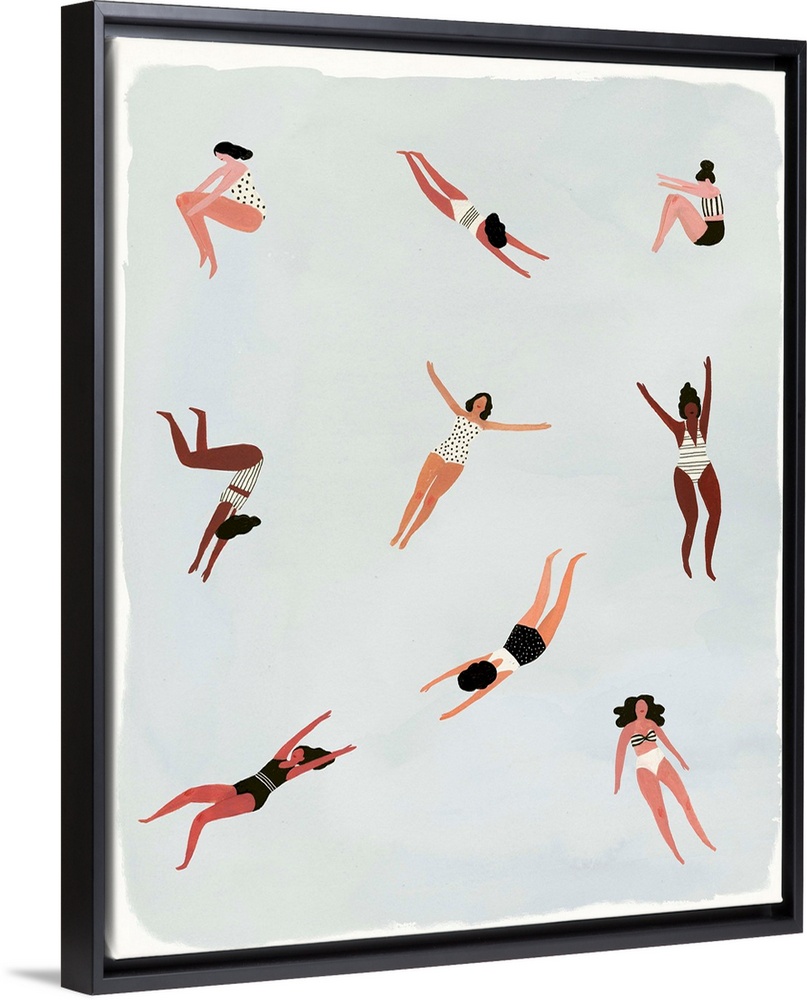 <p>Contemporary figurative painting of various women in swim suits diving and swimming.</p>