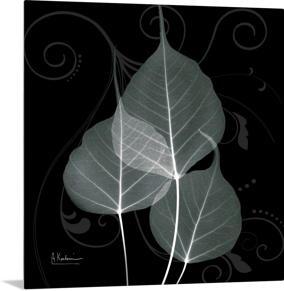 <p>An x-ray of three leaves mint bo tree leaves on a black and grey designed background.</p>