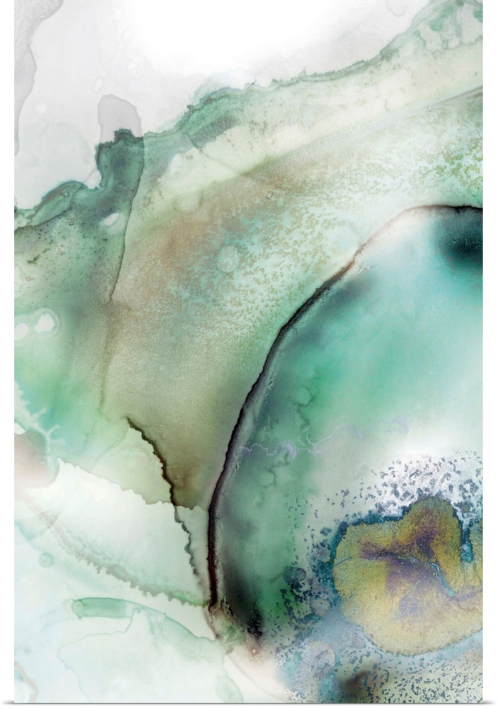 <p>Abstract watercolor artwork of softly blending shades of teal and jade green.</p>