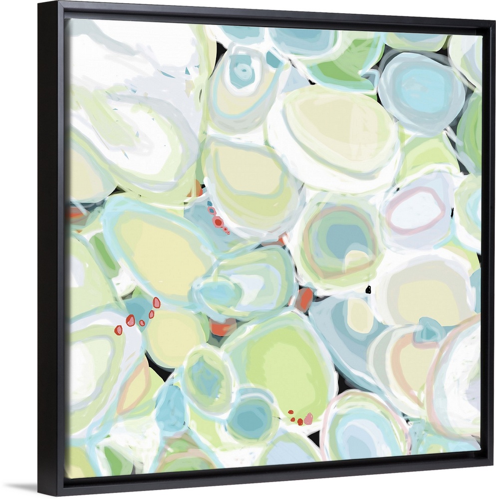 <p>A series of layered shapes in blue and green with the feel of water gently flowing over each delicate shape. The calm blue and green tones make this piece a great fit for a living room, bedroom, office or lobby and for hospitality as well.</p>