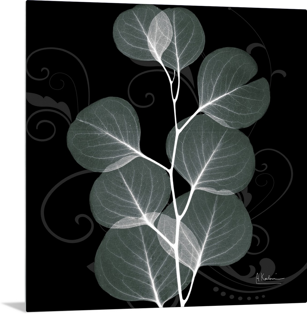 <p>An x-ray of mint eucalyptus leaves on a black and grey designed background.</p>