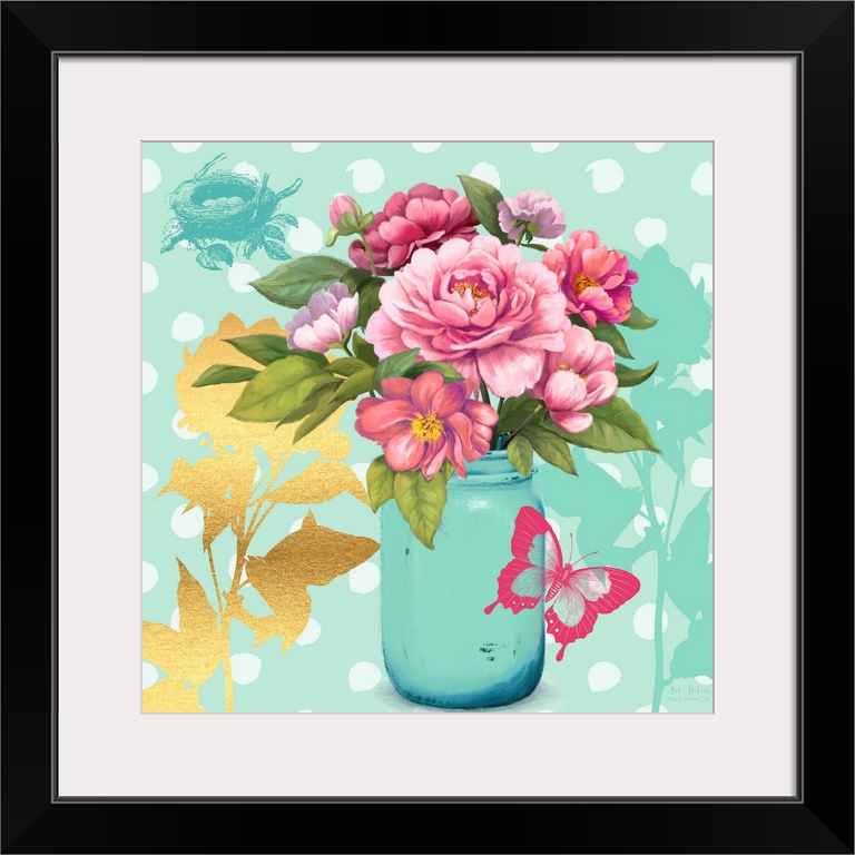 <p>Contemporary home decor artwork of a vibrant pink flowers in a light blue mason jar against a light blue polka dot background.</p>