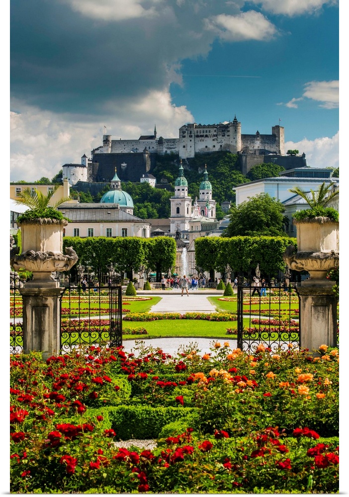 <p>Mirabell gardens with Cathedral and Hohensalzburg castle in the background, Salzburg, Austria.</p>