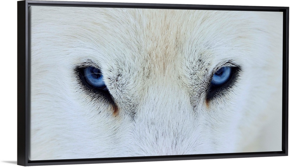 <p>A close-up portrait of a white wolf with piercing blue eyes.</p>