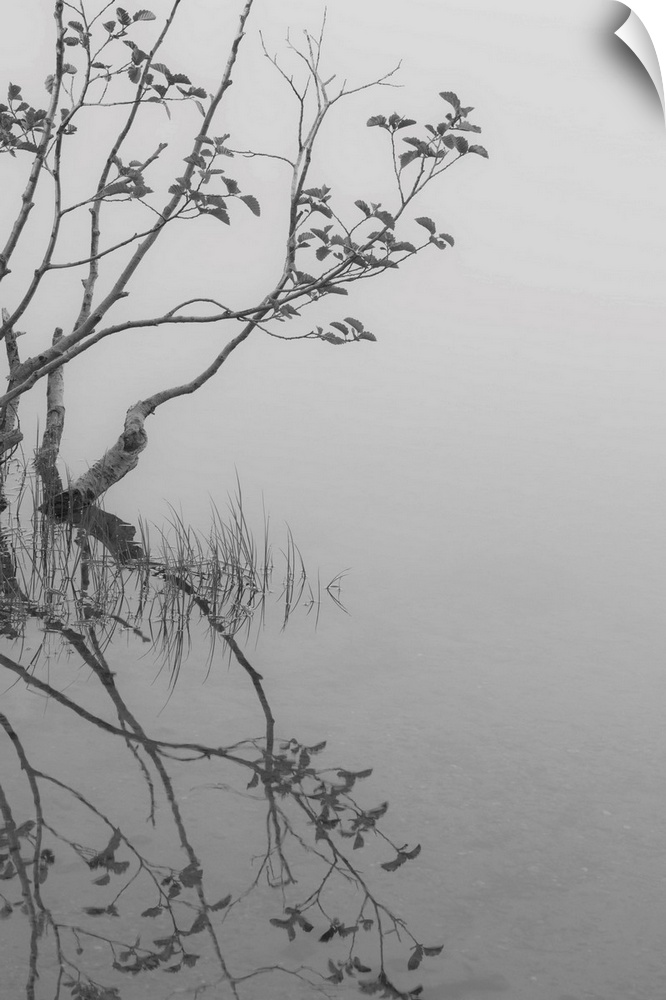 <p>Black and white photograph of reflecting branches and leaves onto water creating a mirror effect.</p>